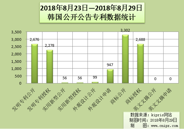 2018年8月23日—2018年8月29日韩国公开公告专利数据统计