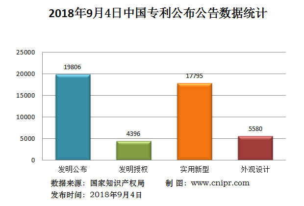 2018年9月4日,中国专利公布数据统计共47577件,其中:发明专利公布19806件;发明专利授权4396件;实用新型专利公告17795件,外观设计专利公告5580件。
