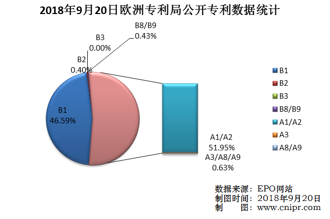 2018年9月20日,欧洲专利局(EPO)公开A类以及B类专利6010件。公布的授权专利(B1):2800件,占总公开量的46.59%;新的专利说明书(B2):24件,占总公开量的0.40%;经限制性修改程序修改后再次公告出版的说明书(B3):0件,占总公开量的0.00%;授权专利扉页的更正/授权专利全文的更正(B8/B9):26件,占总公开量的0.43%;公开新增专利(A1/A2):3122件,占总公开量的51.95%;检索报告(A3):38件,占总公开量的0.63%;扉页的更正/全文说明书的更正(A8/A9):0件,占总公开量的0.00%。