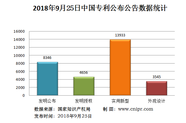 2018年9月25日,中国专利公布数据统计共30480件,其中:发明专利公布8346件;发明专利授权4656件;实用新型专利公告13933件,外观设计专利公告3545件。