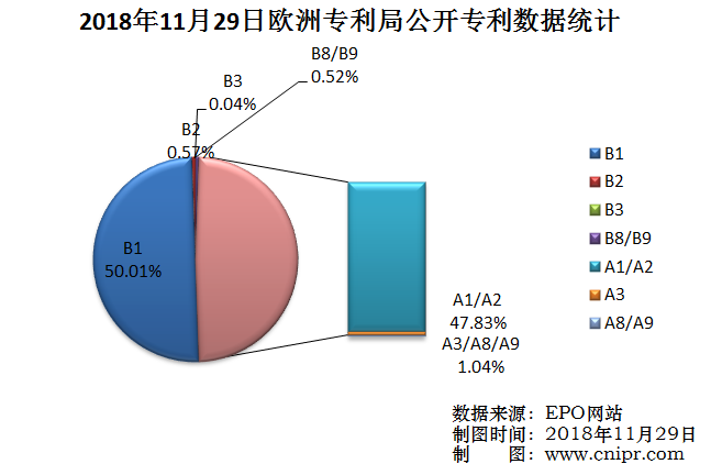2018年11月29日,欧洲专利局(EPO)公开A类以及B类专利5597件。公布的授权专利(B1):2799件,占总公开量的50.01%;新的专利说明书(B2):32件,占总公开量的0.57%;经限制性修改程序修改后再次公告出版的说明书(B3):2件,占总公开量的0.04%;授权专利扉页的更正/授权专利全文的更正(B8/B9):29件,占总公开量的0.52%;公开新增专利(A1/A2):2677件,占总公开量的47.83%;检索报告(A3):58件,占总公开量的1.04%;扉页的更正/全文说明书的更正(A8/A9):0件,占总公开量的0.00%。