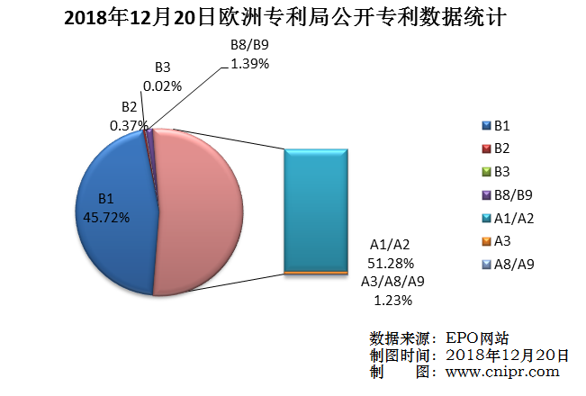 2018年12月20日,欧洲专利局(EPO)公开A类以及B类专利5398件。公布的授权专利(B1):2468件,占总公开量的45.72%;新的专利说明书(B2):20件,占总公开量的0.37%;经限制性修改程序修改后再次公告出版的说明书(B3):1件,占总公开量的0.02%;授权专利扉页的更正/授权专利全文的更正(B8/B9):75件,占总公开量的1.39%;公开新增专利(A1/A2):2768件,占总公开量的51.28%;检索报告(A3):63件,占总公开量的1.17%;扉页的更正/全文说明书的更正(A8/A9):3件,占总公开量的0.06%。