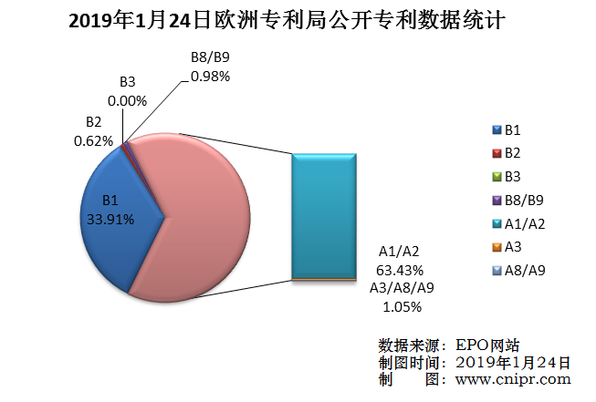 2019年1月24日,欧洲专利局(EPO)公开A类以及B类专利5308件。公布的授权专利(B1):1800件,占总公开量的33.91%;新的专利说明书(B2):33件,占总公开量的0.62%;经限制性修改程序修改后再次公告出版的说明书(B3):0件,占总公开量的0.00%;授权专利扉页的更正/授权专利全文的更正(B8/B9):52件,占总公开量的0.98%;公开新增专利(A1/A2):3367件,占总公开量的63.43%;检索报告(A3):50件,占总公开量的0.94%;扉页的更正/全文说明书的更正(A8/A9):6件,占总公开量的0.11%。