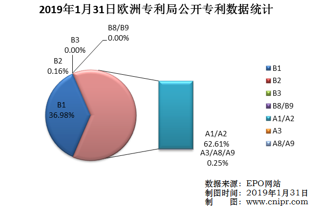 2019年1月31日,欧洲专利局(EPO)公开A类以及B类专利4867件。公布的授权专利(B1):1800件,占总公开量的36.98%;新的专利说明书(B2):8件,占总公开量的0.16%;经限制性修改程序修改后再次公告出版的说明书(B3):0件,占总公开量的0.00%;授权专利扉页的更正/授权专利全文的更正(B8/B9):0件,占总公开量的0.00%;公开新增专利(A1/A2):3047件,占总公开量的62.61%;检索报告(A3):12件,占总公开量的0.25%;扉页的更正/全文说明书的更正(A8/A9):0件,占总公开量的0.00%。