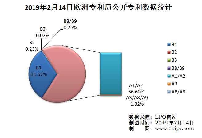 2019年2月14日,欧洲专利局(EPO)公开A类以及B类专利4305件。公布的授权专利(B1):1359件,占总公开量的31.57%;新的专利说明书(B2):10件,占总公开量的0.23%;经限制性修改程序修改后再次公告出版的说明书(B3):1件,占总公开量的0.02%;授权专利扉页的更正/授权专利全文的更正(B8/B9):11件,占总公开量的0.26%;公开新增专利(A1/A2):2867件,占总公开量的66.60%;检索报告(A3):57件,占总公开量的1.32%;扉页的更正/全文说明书的更正(A8/A9):0件,占总公开量的0.00%。