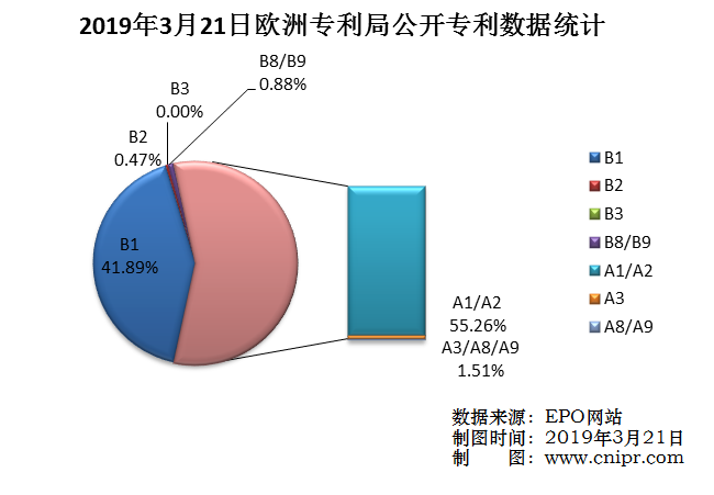 2019年3月21日,欧洲专利局(EPO)公开A类以及B类专利5780件。公布的授权专利(B1):2421件,占总公开量的41.89%;新的专利说明书(B2):27件,占总公开量的0.47%;经限制性修改程序修改后再次公告出版的说明书(B3):0件,占总公开量的0.00%;授权专利扉页的更正/授权专利全文的更正(B8/B9):51件,占总公开量的0.88%;公开新增专利(A1/A2):3194件,占总公开量的55.26%;检索报告(A3):83件,占总公开量的1.44%;扉页的更正/全文说明书的更正(A8/A9):4件,占总公开量的0.07%。