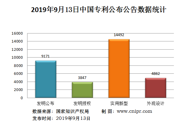 2019年9月13日,中国专利公布数据统计共32372件,其中:发明专利公布9171件;发明专利授权3847件;实用新型专利公告14492件;外观设计专利公告4862件。