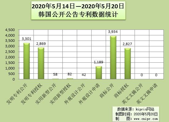 2020年5月14日—2020年5月20日韩国公开公告专利数据统计