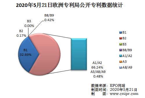 2020年5月21日,欧洲专利局(EPO)公开A类以及B类专利4802件。公布的授权专利(B1):1570件,占总公开量的32.69%;新的专利说明书(B2):8件,占总公开量的0.17%;经限制性修改程序修改后再次公告出版的说明书(B3):0件,占总公开量的0.00%;授权专利扉页的更正/授权专利全文的更正(B8/B9):20件,占总公开量的0.42%;公开新增专利(A1/A2):3181件,占总公开量的66.24%;检索报告(A3):20件,占总公开量的0.42%;扉页的更正/全文说明书的更正(A8/A9):3件,占总公开量的0.06%。