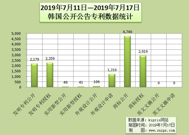 2019年7月11日—2019年7月17日韩国公开公告专利数据统计