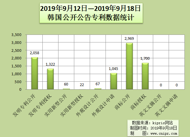2019年9月12日—2019年9月18日韩国公开公告专利数据统计