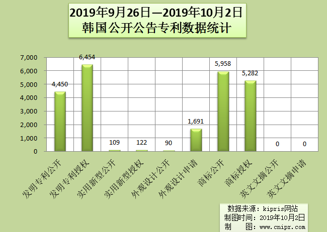 2019年9月26日—2019年10月2日韩国公开公告专利数据统计