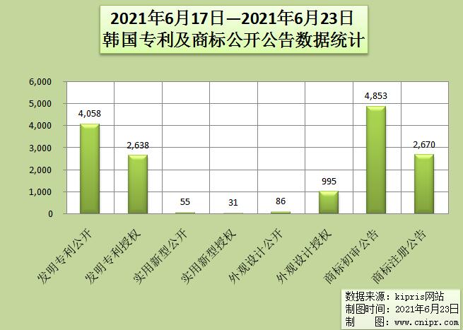 2021年6月17日—2021年6月23日韩国专利及商标公开公告数据统计