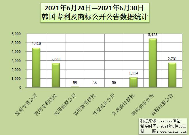 2021年6月24日—2021年6月30日韩国专利及商标公开公告数据统计