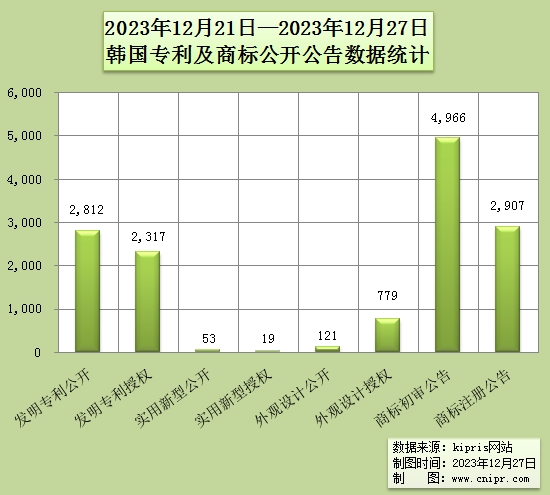 本期韩国数据发明专利公开2812件;发明专利授权2317件;实用新型公开53件;实用新型授权19件;外观设计公开121件;外观设计授权779件;商标初审公告4966件;商标注册公告2907件。