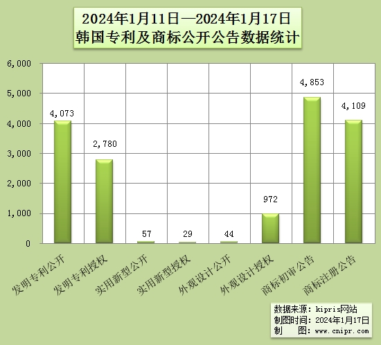 本期韩国数据发明专利公开4073件;发明专利授权2780件;实用新型公开57件;实用新型授权29件;外观设计公开44件;外观设计授权972件;商标初审公告4853件;商标注册公告4109件。