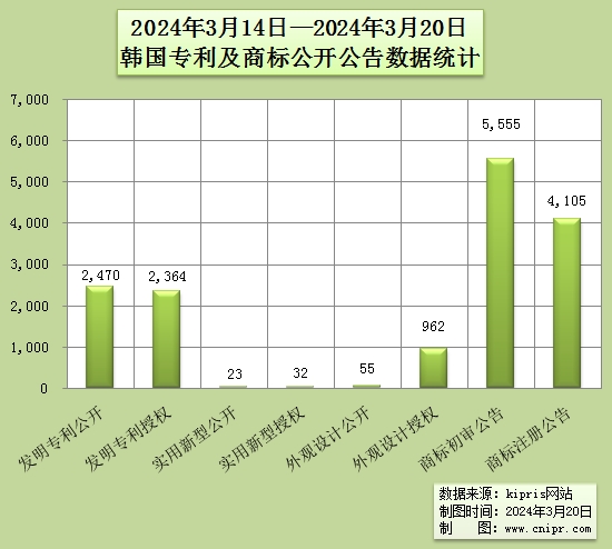 2024年3月14日—2024年3月20日韩国专利及商标公开公告数据统计