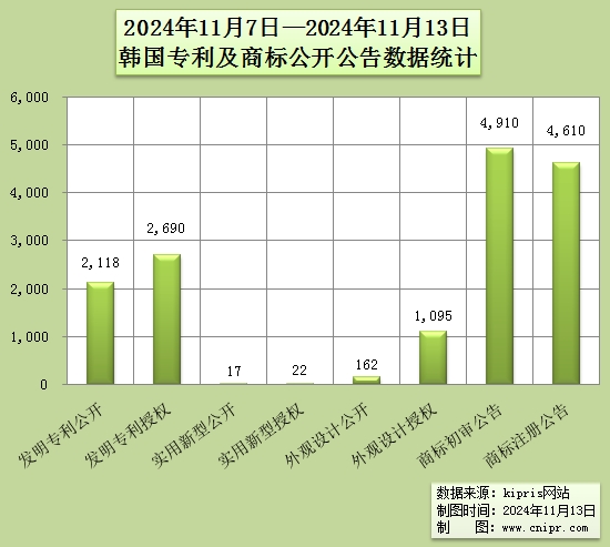 2024年11月7日—2024年11月13日韩国专利及商标公开公告数据统计
