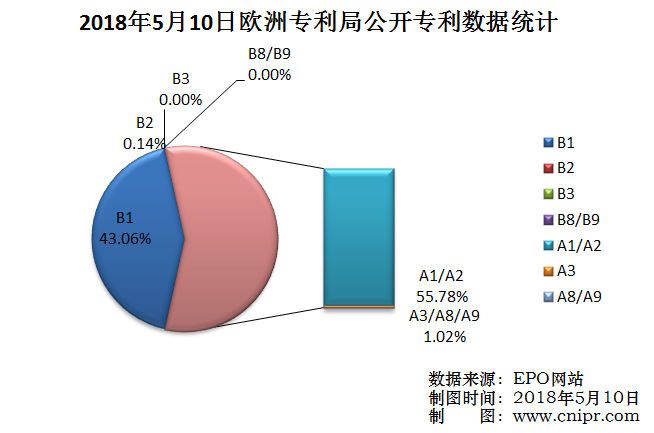 2018年5月10日,欧洲专利局(EPO)公开A类以及B类专利4900件。公布的授权专利(B1):2110件,占总公开量的43.06%;新的专利说明书(B2):7件,占总公开量的0.14%;经限制性修改程序修改后再次公告出版的说明书(B3):0件,占总公开量的0.00%;授权专利扉页的更正/授权专利全文的更正(B8/B9):0件,占总公开量的0.00%;公开新增专利:(A1/A2)2733件,占总公开量的55.78%;检索报告(A3):48件,占总公开量的0.98%;扉页的更正/全文说明书的更正(A8/A9):2件,占总公开量的0.04%。