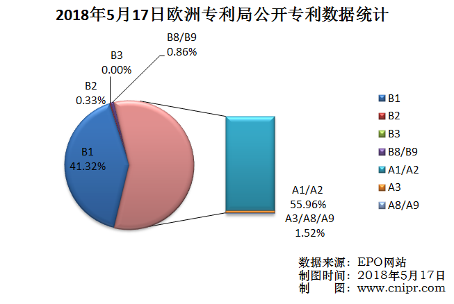 2018年5月17日,欧洲专利局(EPO)公开A类以及B类专利5123件。公布的授权专利(B1):2117件,占总公开量的41.32%;新的专利说明书(B2):17件,占总公开量的0.33%;经限制性修改程序修改后再次公告出版的说明书(B3):0件,占总公开量的0.00%;授权专利扉页的更正/授权专利全文的更正(B8/B9):44件,占总公开量的0.86%;公开新增专利:(A1/A2)2867件,占总公开量的55.96%;检索报告(A3):74件,占总公开量的1.44%;扉页的更正/全文说明书的更正(A8/A9):4件,占总公开量的0.08%。