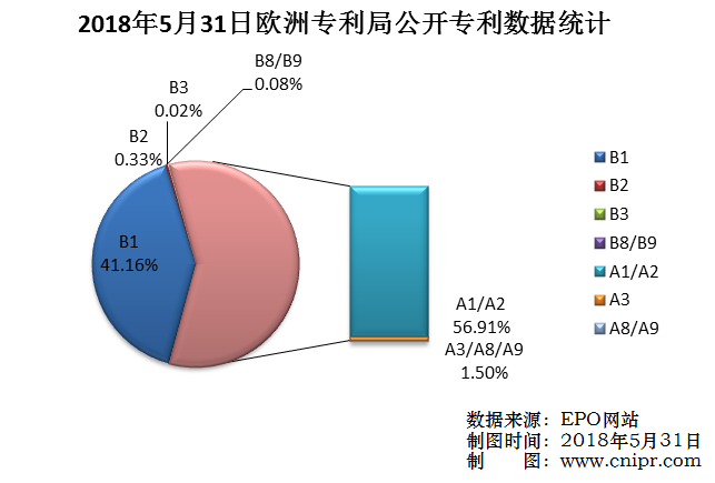 2018年5月31日,欧洲专利局(EPO)公开A类以及B类专利6074件。公布的授权专利(B1):2500件,占总公开量的41.16%;新的专利说明书(B2):20件,占总公开量的0.33%;经限制性修改程序修改后再次公告出版的说明书(B3):1件,占总公开量的0.02%;授权专利扉页的更正/授权专利全文的更正(B8/B9):5件,占总公开量的0.08%;公开新增专利:(A1/A2)3457件,占总公开量的56.91%;检索报告(A3):91件,占总公开量的1.50%;扉页的更正/全文说明书的更正(A8/A9):0件,占总公开量的0.00%。