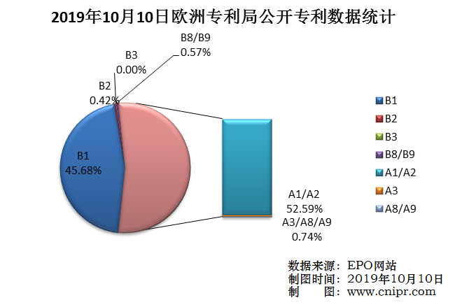 2019年10月10日,欧洲专利局(EPO)公开A类以及B类专利5963件。公布的授权专利(B1):2724件,占总公开量的45.68%;新的专利说明书(B2):25件,占总公开量的0.42%;经限制性修改程序修改后再次公告出版的说明书(B3):0件,占总公开量的0.00%;授权专利扉页的更正/授权专利全文的更正(B8/B9):34件,占总公开量的0.57%;公开新增专利(A1/A2):3136件,占总公开量的52.59%;检索报告(A3):44件,占总公开量的0.74%;扉页的更正/全文说明书的更正(A8/A9):0件,占总公开量的0.00%。