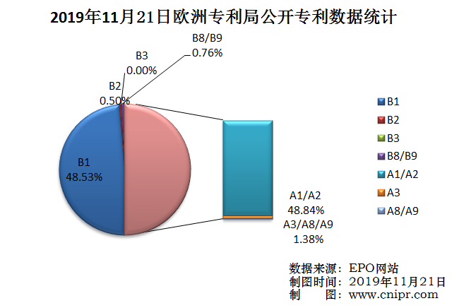 2019年11月21日,欧洲专利局(EPO)公开A类以及B类专利5428件。公布的授权专利(B1):2634件,占总公开量的48.53%;新的专利说明书(B2):27件,占总公开量的0.50%;经限制性修改程序修改后再次公告出版的说明书(B3):0件,占总公开量的0.00%;授权专利扉页的更正/授权专利全文的更正(B8/B9):41件,占总公开量的0.76%;公开新增专利(A1/A2):2651件,占总公开量的48.84%;检索报告(A3):73件,占总公开量的1.34%;扉页的更正/全文说明书的更正(A8/A9):2件,占总公开量的0.04%。