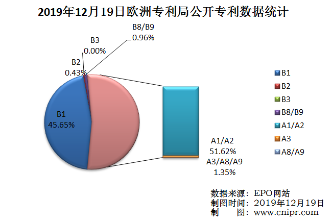 2019年12月19日,欧洲专利局(EPO)公开A类以及B类专利5645件。公布的授权专利(B1):2577件,占总公开量的45.65%;新的专利说明书(B2):24件,占总公开量的0.43%;经限制性修改程序修改后再次公告出版的说明书(B3):0件,占总公开量的0.00%;授权专利扉页的更正/授权专利全文的更正(B8/B9):54件,占总公开量的0.96%;公开新增专利(A1/A2):2914件,占总公开量的51.62%;检索报告(A3):76件,占总公开量的1.35%;扉页的更正/全文说明书的更正(A8/A9):0件,占总公开量的0.00%。