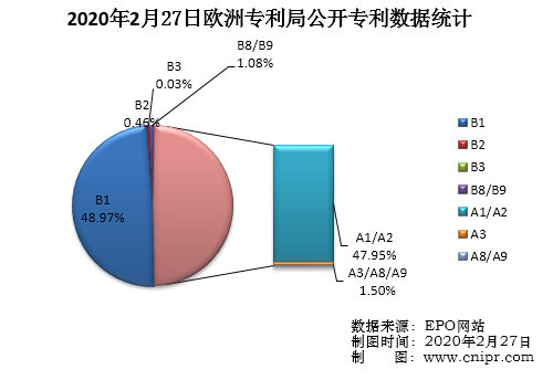 2020年2月27日,欧洲专利局(EPO)公开A类以及B类专利5852件。公布的授权专利(B1):2866件,占总公开量的48.97%;新的专利说明书(B2):27件,占总公开量的0.46%;经限制性修改程序修改后再次公告出版的说明书(B3):2件,占总公开量的0.03%;授权专利扉页的更正/授权专利全文的更正(B8/B9):63件,占总公开量的1.08%;公开新增专利(A1/A2):2806件,占总公开量的47.95%;检索报告(A3):84件,占总公开量的1.44%;扉页的更正/全文说明书的更正(A8/A9):4件,占总公开量的0.07%。