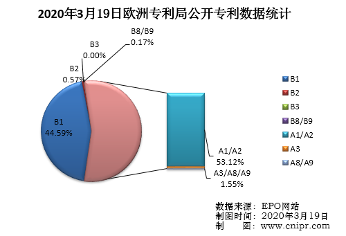 2020年3月19日,欧洲专利局(EPO)公开A类以及B类专利5936件。公布的授权专利(B1):2647件,占总公开量的44.59%;新的专利说明书(B2):34件,占总公开量的0.57%;经限制性修改程序修改后再次公告出版的说明书(B3):0件,占总公开量的0.00%;授权专利扉页的更正/授权专利全文的更正(B8/B9):10件,占总公开量的0.17%;公开新增专利(A1/A2):3153件,占总公开量的53.12%;检索报告(A3):82件,占总公开量的1.38%;扉页的更正/全文说明书的更正(A8/A9):10件,占总公开量的0.17%。