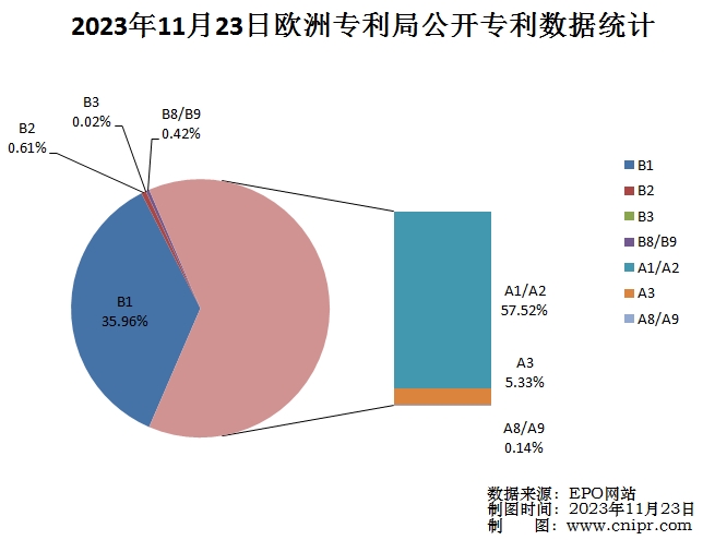2023年11月23日,欧洲专利局(EPO)公开A类以及B类专利5906件。经审查的授权专利说明书(B1):2124件,占总公开量的35.96%;修正的专利说明书(B2):36件,占总公开量的0.61%;限制程序后公布(B3):1件,占总公开量的0.02%;授权专利扉页的更正/授权专利全文的更正(B8/B9):25件,占总公开量的0.42%;专利申请公布(A1/A2):3397件,占总公开量的57.52%;检索报告(A3):315件,占总公开量的5.33%;专利扉页更正/专利全文更正(A8/A9):8件,占总公开量的0.14%。