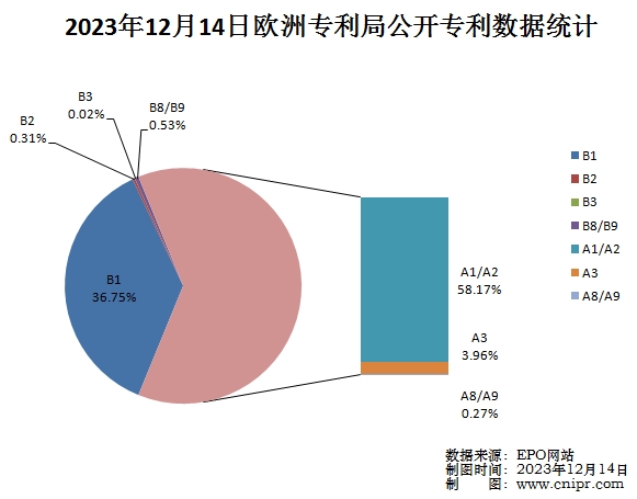 2023年12月14日,欧洲专利局(EPO)公开A类以及B类专利5486件。经审查的授权专利说明书(B1):2016件,占总公开量的36.75%;修正的专利说明书(B2):17件,占总公开量的0.31%;限制程序后公布(B3):1件,占总公开量的0.02%;授权专利扉页的更正/授权专利全文的更正(B8/B9):29件,占总公开量的0.53%;专利申请公布(A1/A2):3191件,占总公开量的58.17%;检索报告(A3):217件,占总公开量的3.96%;专利扉页更正/专利全文更正(A8/A9):15件,占总公开量的0.27%。