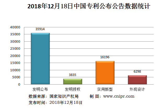 2018年12月18日,中国专利公布数据统计共62243件,其中:发明专利公布35914件;发明专利授权3835件;实用新型专利公告16196件;外观设计专利公告6298件。