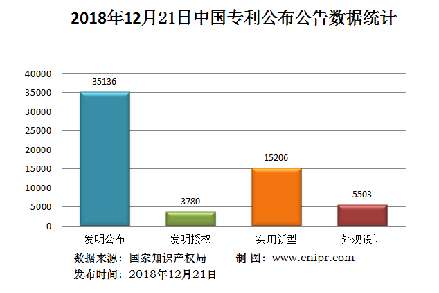 2018年12月21日,中国专利公布数据统计共59625件,其中:发明专利公布35136件;发明专利授权3780件;实用新型专利公告15206件;外观设计专利公告5503件。