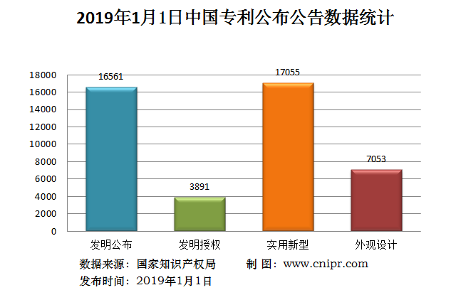 2019年1月1日,中国专利公布数据统计共44560件,其中:发明专利公布16561件;发明专利授权3891件;实用新型专利公告17055件;外观设计专利公告7053件。
