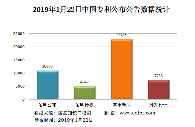 2019年1月22日,中国专利公布数据统计共45741件,其中:发明专利公布10876件;发明专利授权4847件;实用新型专利公告22785件;外观设计专利公告7233件。