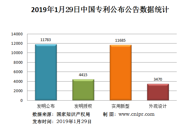 2019年1月29日,中国专利公布数据统计共31353件,其中:发明专利公布11783件;发明专利授权4415件;实用新型专利公告11685件;外观设计专利公告3470件。