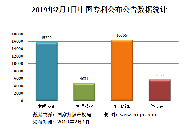 2019年2月1日,中国专利公布数据统计共42382件,其中:发明专利公布15722件;发明专利授权4651件;实用新型专利公告16356件;外观设计专利公告5653件。