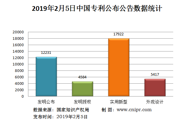 2019年2月5日,中国专利公布数据统计共40154件,其中:发明专利公布12231件;发明专利授权4584件;实用新型专利公告17922件;外观设计专利公告5417件。