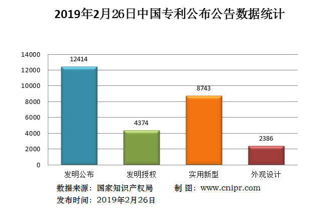 2019年2月26日,中国专利公布数据统计共27917件,其中:发明专利公布12414件;发明专利授权4374件;实用新型专利公告8743件;外观设计专利公告2386件。