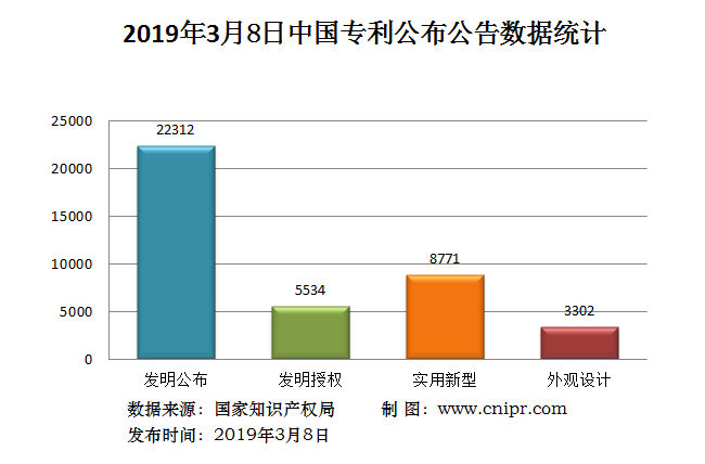 2019年3月8日,中国专利公布数据统计共39919件,其中:发明专利公布22312件;发明专利授权5534件;实用新型专利公告8771件;外观设计专利公告3302件。
