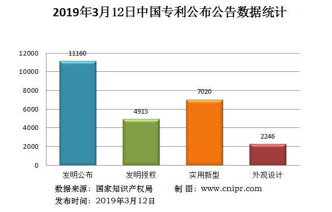 2019年3月12日,中国专利公布数据统计共25341件,其中:发明专利公布11160件;发明专利授权4915件;实用新型专利公告7020件;外观设计专利公告2246件。