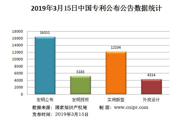 2019年3月15日,中国专利公布数据统计共37952件,其中:发明专利公布16351件;发明专利授权5183件;实用新型专利公告12104件;外观设计专利公告4314件。