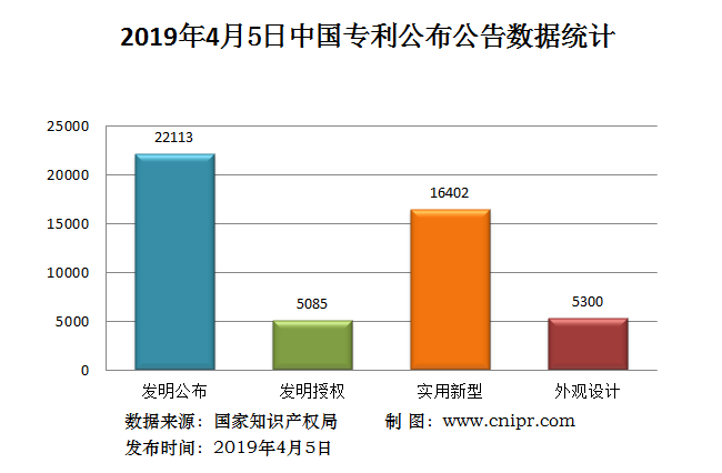 2019年4月5日,中国专利公布数据统计共48900件,其中:发明专利公布22113件;发明专利授权5085件;实用新型专利公告16402件;外观设计专利公告5300件。
