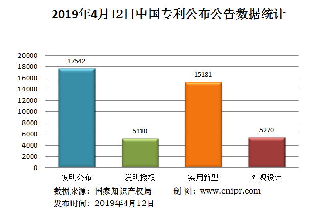 2019年4月12日,中国专利公布数据统计共43103件,其中:发明专利公布17542件;发明专利授权5110件;实用新型专利公告15181件;外观设计专利公告5270件。