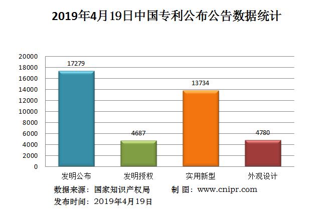 2019年4月19日,中国专利公布数据统计共40480件,其中:发明专利公布17279件;发明专利授权4687件;实用新型专利公告13734件;外观设计专利公告4780件。