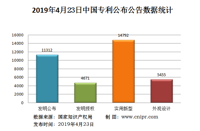 2019年4月23日,中国专利公布数据统计共36230件,其中:发明专利公布11312件;发明专利授权4671件;实用新型专利公告14792件;外观设计专利公告5455件。
