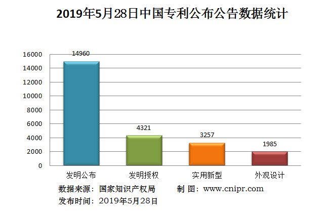 2019年5月28日,中国专利公布数据统计共24523件,其中:发明专利公布14960件;发明专利授权4321件;实用新型专利公告3257件;外观设计专利公告1985件。