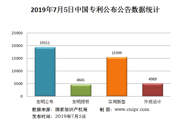 2019年7月5日,中国专利公布数据统计共44340件,其中:发明专利公布19311件;发明专利授权4641件;实用新型专利公告15399件;外观设计专利公告4989件。