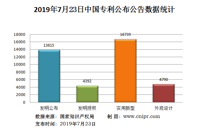 2019年7月23日,中国专利公布数据统计共39736件,其中:发明专利公布13815件;发明专利授权4392件;实用新型专利公告16739件;外观设计专利公告4790件。